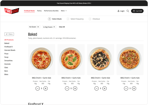 Revamped Fireroad’s website to enhance UX and optimize the shopping journey for plant-based, high-protein meals, with intuitive navigation, seamless browsing, and clear product presentation.